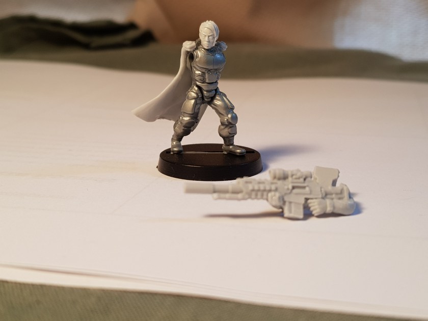 The sniper is coming along nicely! The head swap went fine, and although I was worried about the cloak at first it seems to have fitted on quite nicely. The weapon fitted nicely into the arms as well. At this point I have two modules – the figure and the arm/weapon set. I’ll paint them separately and then assemble them. I’m feeling good about this one, and I’m confident it’ll come come together well and look good.