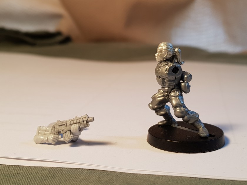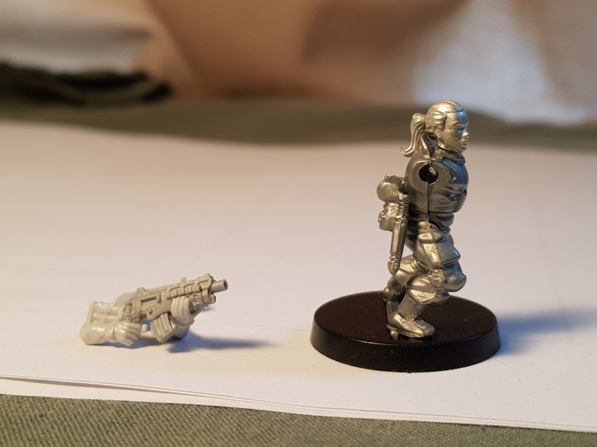 Subject F is also coming along pretty well. The arms and weapon fitted together fairly well, and the head swap went okay too (although it was very hard to get the ponytail to stay where I wanted it). This is another conversion I’m confident about, and I’m looking forward to seeing how it looks when painted.