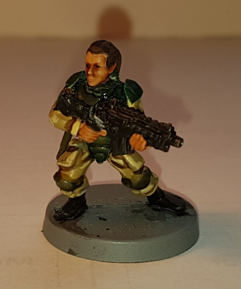 I’m actually really pleased with how this guy turned out. I thought the mask and symbol on the medical kit would look terrible, but they’re actually not bad. The arms were again specifically intended for these torsos, but the head is from a Mad Robot product and perhaps slightly too big. It’s not noticeable at any normal gaming distance, though, so I’m very happy with this conversion.